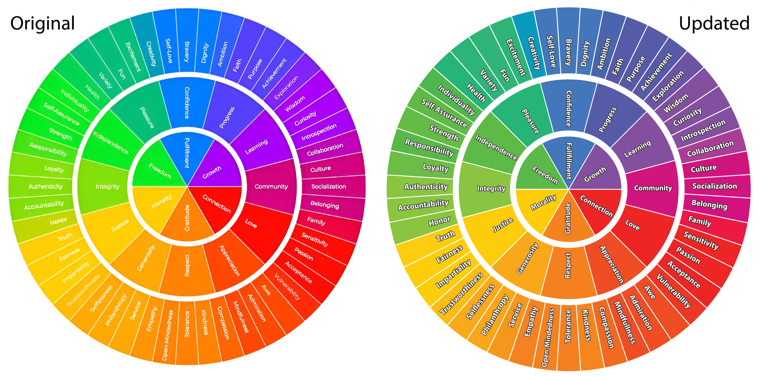 The client was frustrated with the core value wheel because, while the information itself was valuable, the design made it difficult to absorb. The layout was visually overcrowded and oversaturated. Typography lacked hierarchy. Instead of guiding the viewer through the content, the design forced them to work to decipher it—reducing clarity, slowing comprehension, and ultimately diminishing the impact of the message.